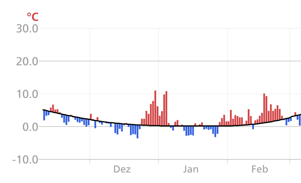Lufttemperatur im Winter 2021/2022 der Meteoschweiz Station in Zollikofen – Abweichungen zum langjährigen Tagesmittel (schwarze Linie)